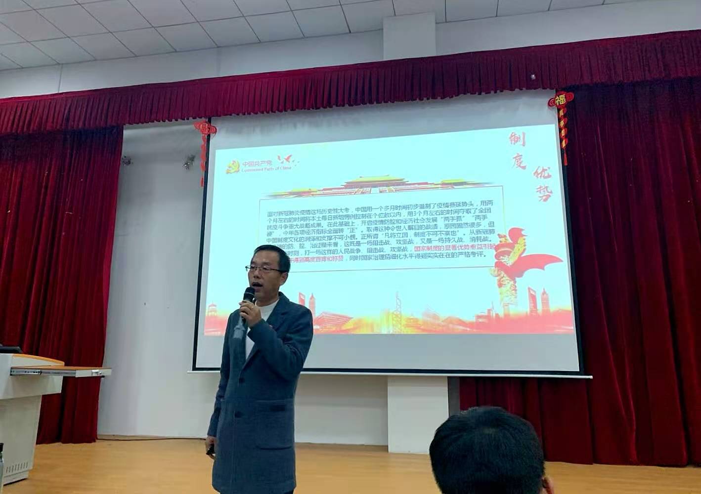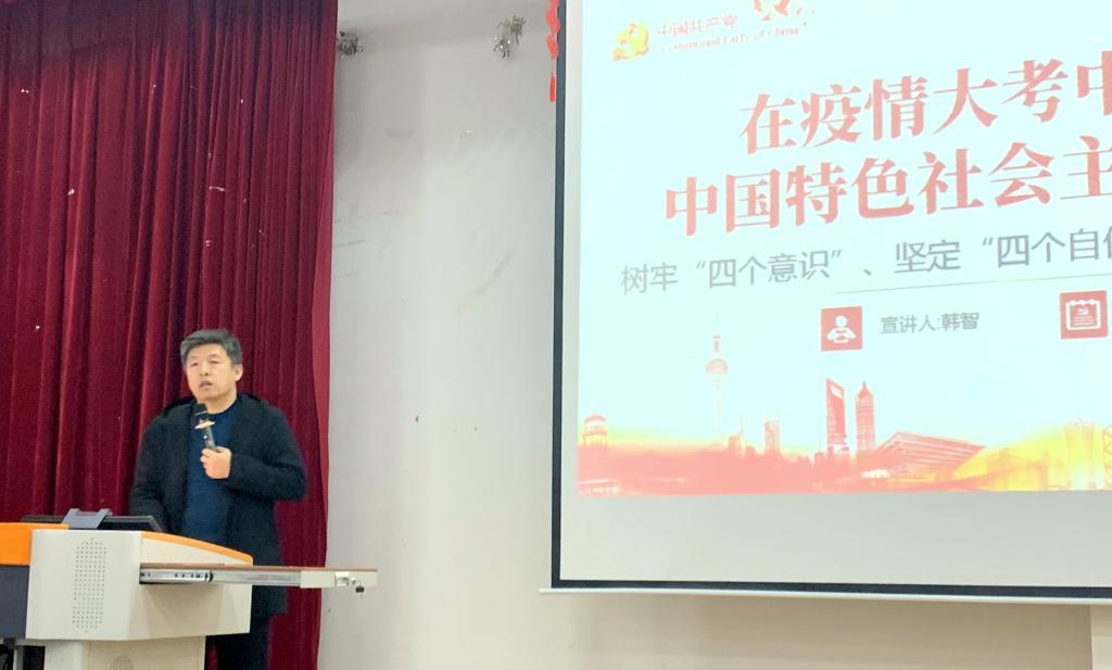 为弘扬爱国主义精神,加强党员教育,提高党员党性修养,11月9日晚上6点,beat365在线唯一官网在能源楼二楼报告厅开展“在疫情大考中彰显中国特色社会主义制度优势”主题党课。本次党课主讲人为学院党委书记韩智,学院全体学生党员、学生预备党员以及入党积极分子参与学习,会议由党委组织员、学院学生党支部书记姜海鹏主持。