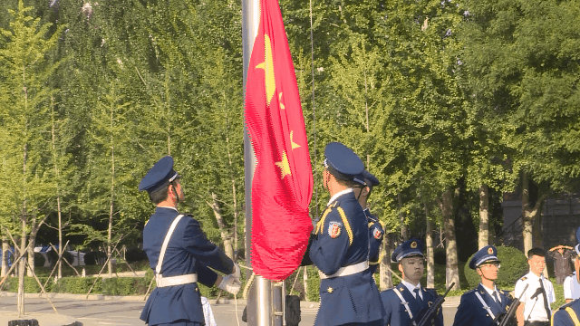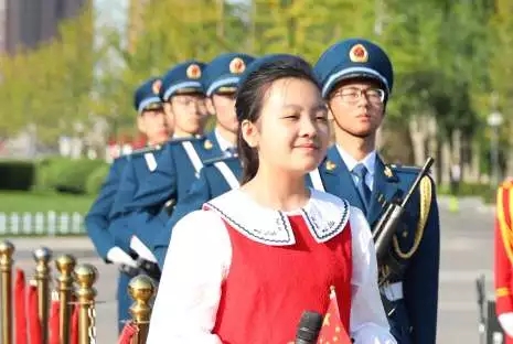 尖兵队和国旗班70步铿锵正步护送国旗入场。五星红旗冉冉升起,全体师生注视着升起的国旗高唱国歌。