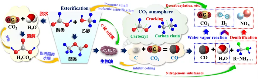 将得到的生物油置于CO2反应气氛中进行提质,显著增加了小分子生物油的占比并降低生物油中酸类物质的含量。论文提出了以下反应机理: