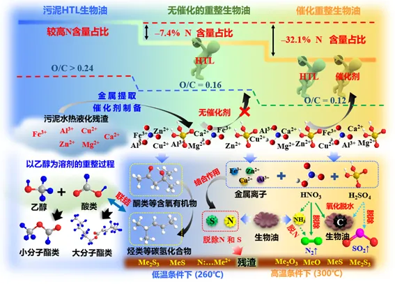 提取污泥HTL残渣中Fe、Al、Mg、Zn和Cu等金属离子制备成硫酸盐和硝酸盐催化剂,用于生物油的催化提质过程,发现硫酸盐和硝酸盐催化剂能有效降低生物油中N含量并促进生物油分子的脱氧反应。论文提出了以下反应机理: