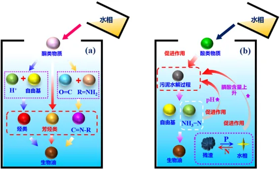 论文在污泥水热液化制备生物油过程中,使用水相作为溶剂,显著提高了生物油的收率并降低水相的COD。论文提出了这一过程的作用机理可分为两阶段: