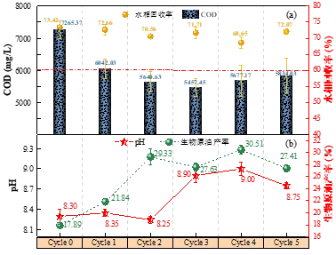 图1 循环次数对水相COD、回收率(a)和水相pH(b)的影响